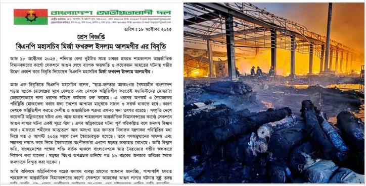 আজ ১৮ অক্টোবর ২০২৫, শনিবার বেলা দুইটার সময় ঢাকার হযরত শাহজালাল আন্তর্জাতিক বিমানবন্দরের কার্গো সেকশনে আগুন লেগে ব্যাপক ক্ষয়ক্ষতি ও কয়েকজন আহতের ঘটনায় গভীর উদ্বেগ প্রকাশ করে বিবৃতি দিয়েছেন বিএনপি মহাসচিব মির্জা ফখরুল ইসলাম আলমগীর।