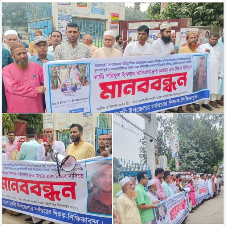 মানববন্ধনে শিক্ষককরা বলেন, কাজী শরিফুল ইসলাম শাকিল নামের এক ব্যক্তি দীর্ঘদিন ধরে সামাজিক যোগাযোগ মাধ্যমে শিক্ষকদের নিয়ে কুরুচিপূর্ণ মন্তব্য এবং বিভ্রান্তিকর তথ্য ছড়াচ্ছে, যা শিক্ষক সমাজের ভাবমূর্তি নষ্ট করছে। এ সময় তাঁরা শাকিলকে দ্রুত গ্রেপ্তার করে দৃষ্টান্তমূলক শাস্তির দাবি জানান।