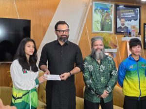 আজ শনিবার (২০ ডিসেম্বর) সকালে রাজধানীর পল্লবীর ইস্টার্ন হাউজিং এলাকায় সৌদি আরবের রিয়াদে অনুষ্ঠিত ইসলামিক সলিডারিটি গেমসে বাংলাদেশের হয়ে রৌপ্য পদক জয়ী খই খই সাই মারমার হাতে আর্থিক অনুদান তুলে দেওয়ার সময় এসব কথা বলেন তিনি। বিএনপির ভারপ্রাপ্ত চেয়ারম্যান তারেক রহমান তার পাশে রয়েছেন।