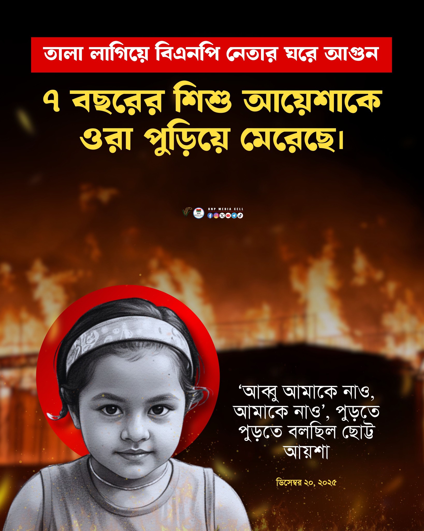 আগুন আর ধোঁয়ার তীব্রতায় ঘুম ভেঙে যায় নাজমা বেগমের। রাত দুইটা বাজে তখন। ঘরের ভেতর আগুন জ্বলছিল। সেই আগুনে পুড়ছিল নাজমার বুকের ধন ৭ বছর বয়সী মেয়ে আয়শা আক্তার। দাউ দাউ করে জ্বলতে থাকা আগুনের মধ্যে দাঁড়িয়ে ছোট্ট আয়শা চিৎকার করছিল, ‘আব্বু, আমাকে নাও, আমাকে নাও।’ চোখের সামনে সেই দৃশ্য দেখলেও কোনোভাবেই আয়শার কাছে যেতে পারেননি মা। পুড়ে যাওয়ার ঘরের পাশে বসে বিলাপ করে কেবল সেই কথাই বলছিলেন তিনি।
