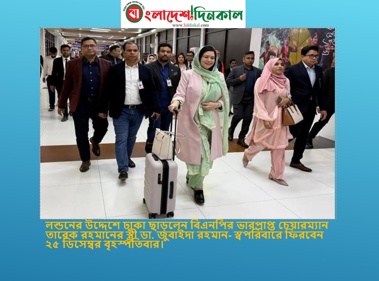 বিডি দিনকাল ডেস্ক :- শনিবার (২০ ডিসেম্বর) সকাল সাড়ে ৮টার দিকে কাতার এয়ারলাইন্সের একটি বিমানে যুক্তরাজ্যের লন্ডনের উদ্দেশে রওনা দিয়েছেন বিএনপির ভারপ্রাপ্ত চেয়ারম্যান তারেক রহমানের স্ত্রী ডা. জুবাইদা রহমান ।
