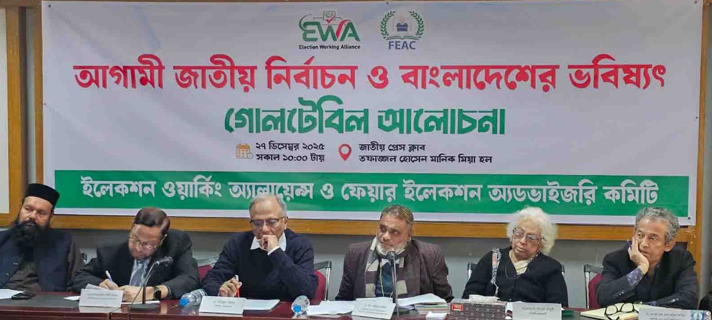 আজ শনিবার (২৭ ডিসেম্বর) সকাল ১০ ঘটিকায় জাতীয় প্রেস ক্লাবের তফাজ্জল হোসেন মানিক মিয়া মিলনায়তনে ইলেকশন ওয়ার্কিং অ্যালায়েন্স এবং ফেয়ার ইলেকশন অ্যাডভাইজরি কমিটির যৌথ উদ্যোগে ‘আগামী জাতীয় নির্বাচন ও বাংলাদেশের ভবিষ্যৎ’ শীর্ষক এক গোলটেবিল আলোচনা সভা অনুষ্ঠিত হয়।