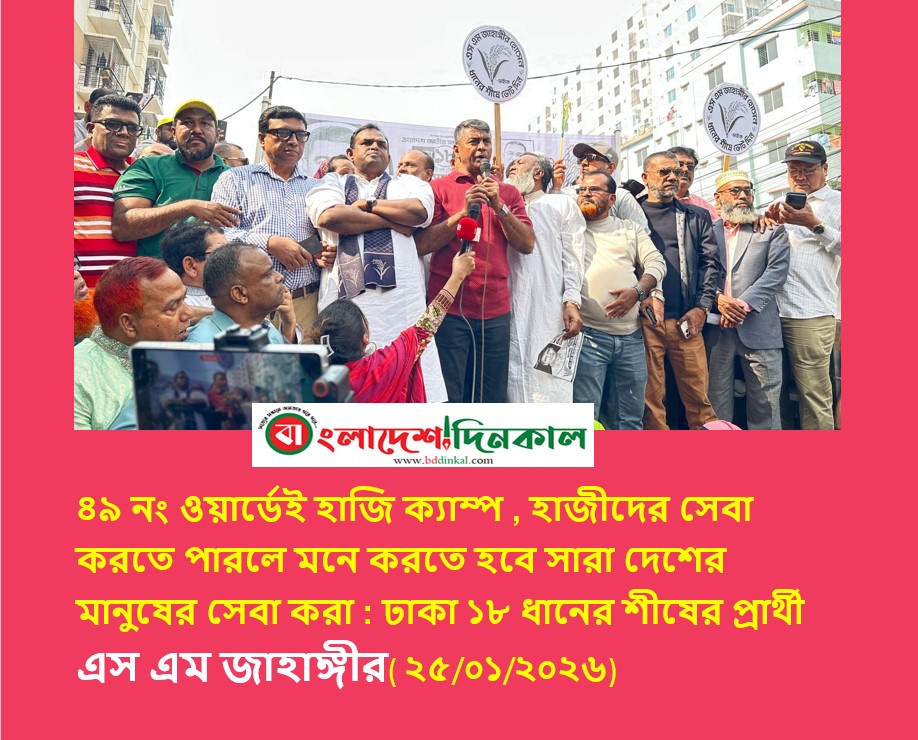 কামরুল হাসান বাবলু : ইসলামের যে ৫ টি স্থম্ভ । যার মধ্যে হজ্জ্ব একটি । সারা বাংলাদেশ থেকে প্রায় দেড় লক্ষ হাজি সাহেবরা এইখানে আসে । অর্থাৎ এই ৪৯ নং ওয়ার্ড একটি গুরুত্বপূর্ণ ওয়ার্ড । এই ওয়ার্ডেই হাজি ক্যাম্প অবস্থিত । বিএনপি যদি ক্ষমতায় আসে এবং আমাকে যদি আপনারা ধানের শীষ মার্কায় নির্বাচিত করেন তাহলে আমাদের সরকার হাজি সাহেবদের জন্য সেবার মান বাড়িয়ে দিবে ।এমনটা বলেছেন ঢাকা ১৮ আসনের ধানের শীষের প্রার্থী ও ঢাকা মহানগর উত্তর বিএনপির অন্যতম সদস্য এস এম জাহাঙ্গীর হোসেন ।